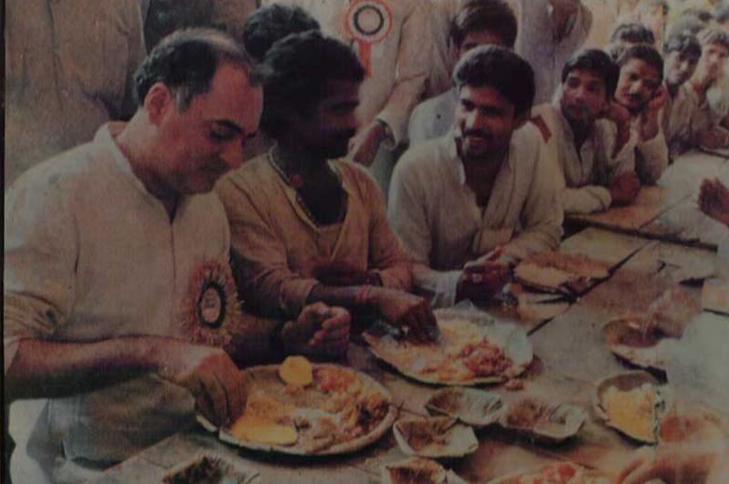Shri Rajiv Gandhi eating food in leaf plate